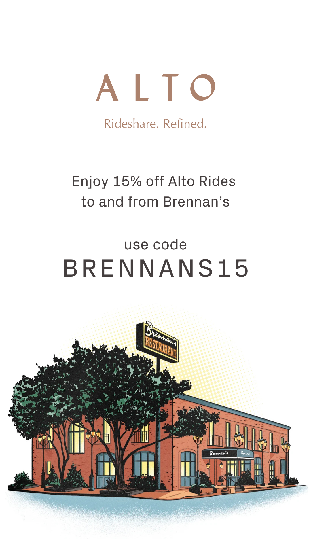 Use the promo code: BRENNANS15 to receive a 15% discount with Alto Rideshare. This code is valid on rides to and from Brennan's of Houston until December 31, 2026.